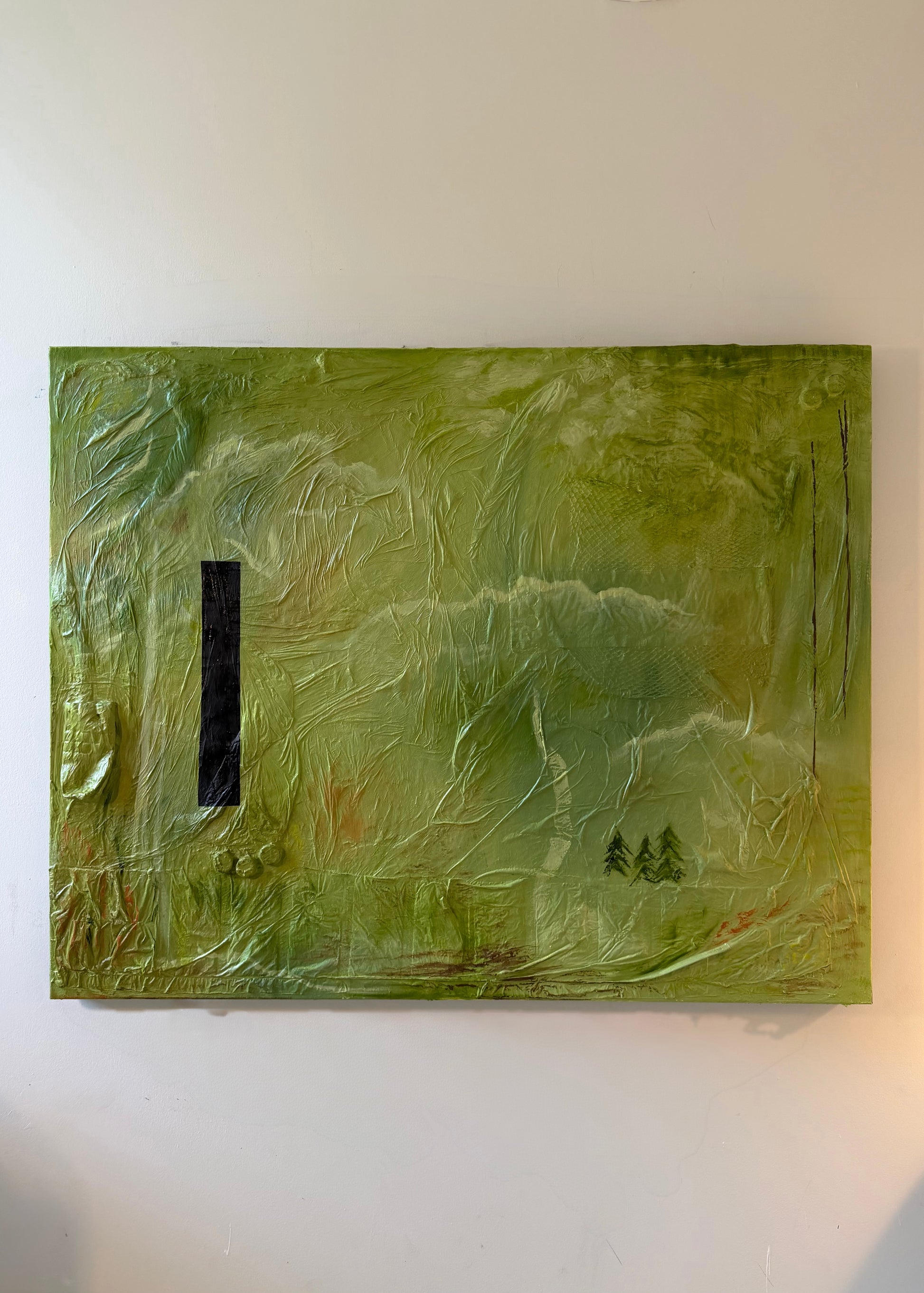 -original painting, mixed media: collected trash materials collaged onto canvas and finished with oil paint