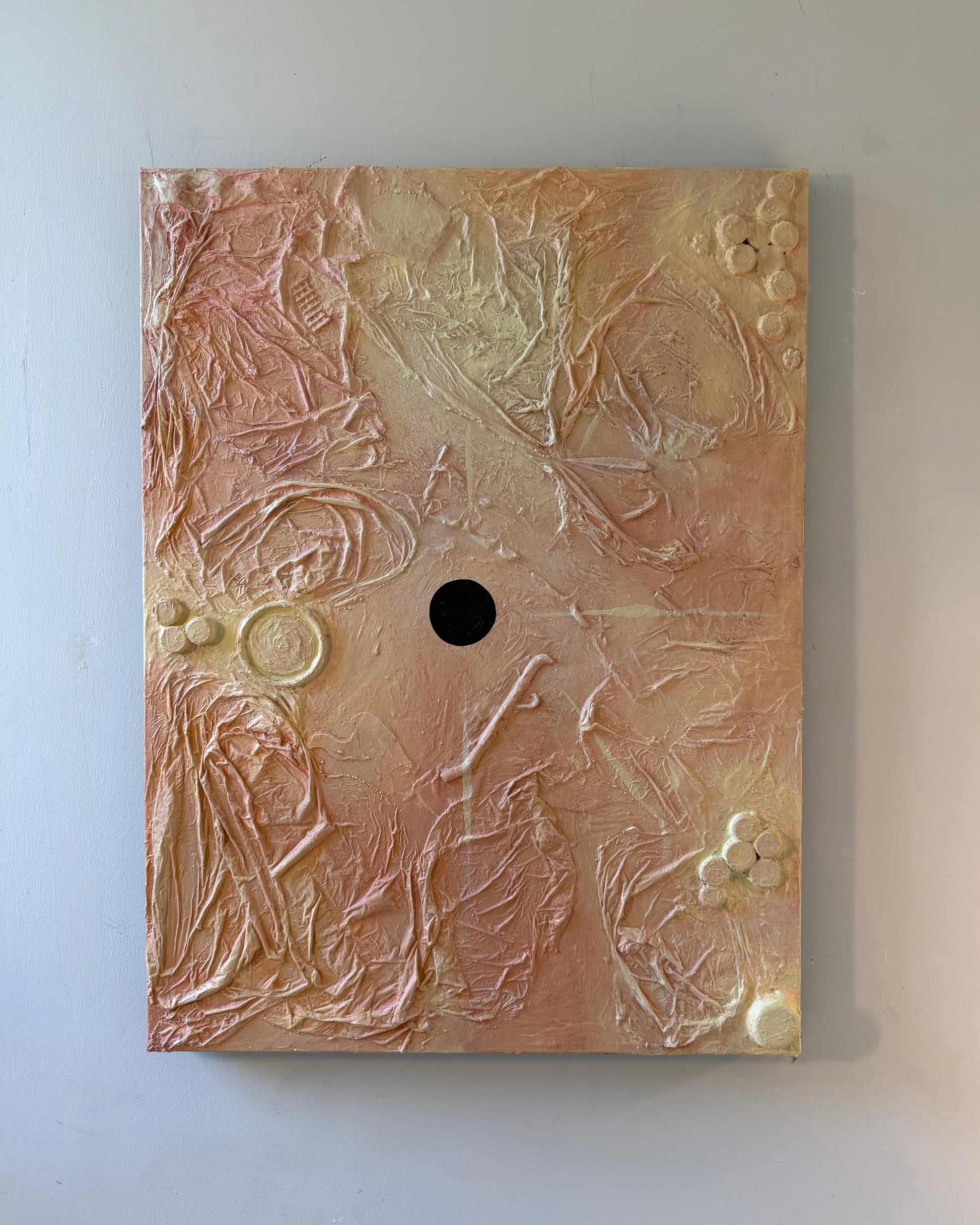 -original painting, mixed media: collected trash materials collaged onto canvas and finished with oil paint